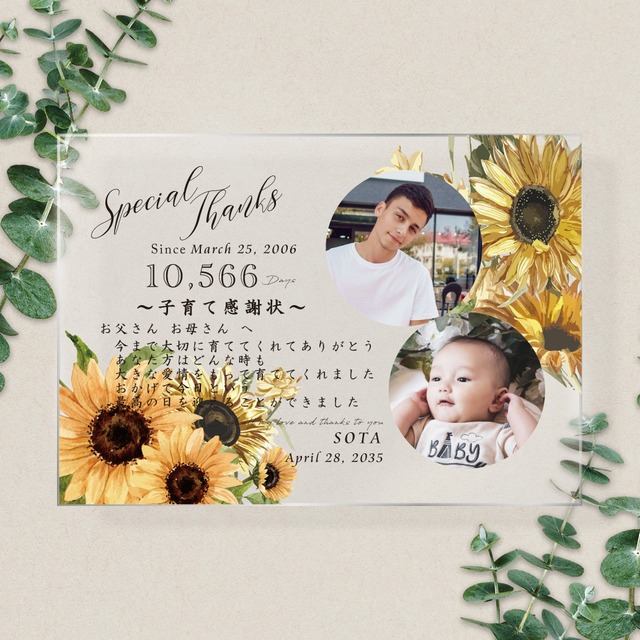 アクリルA4サイズ【子育て感謝状】写真入り 印刷会社仕上げ 両親贈呈品 ひまわり ウェディング 送料無料