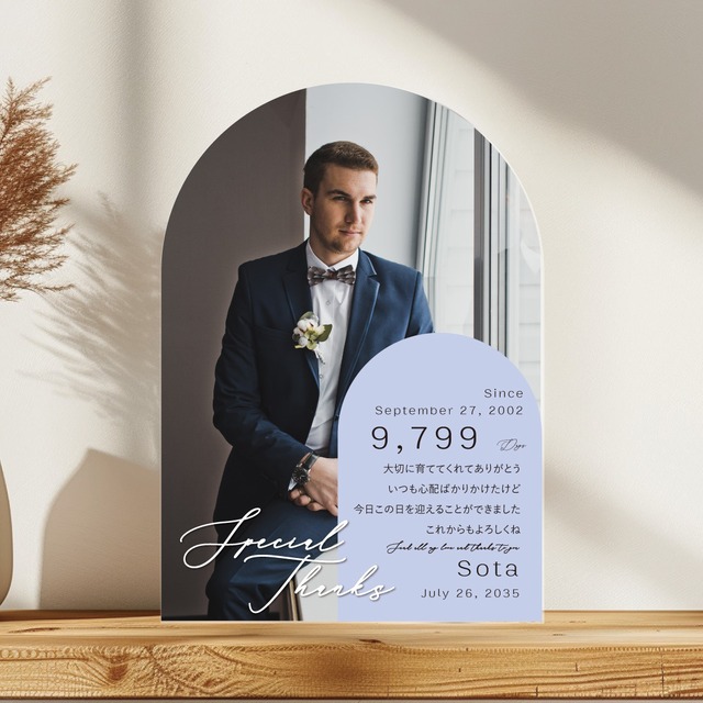 日頃の感謝の気持ちを伝える『子育て感謝状』 透明なアクリルにUV印刷を 専門業者様に依頼するので綺麗な仕上がりです。 ━━━━[お客様へのお願い]━━━━━ ご注文時の備考欄に必ずご記載ください ━━━━━━━━━━━━━━━━━━ ◆お写真はご注文後、 「子供のころ」と「現在」の2枚をご用意いただき、 ファイル転送サービス 【https://gigafile.nu/】または メール 【weddingmomo_noha @yahoo.co.jp】に添付し お名前と購入サイトを お知らせくださいませ。 ※解像度は150dpi以上であれば印刷可能です。 1、お名前(ローマ字) 2、生年月日 3、挙式日 ◆メッセージの変更が必要な場合は必要箇所と詳細 基本メッセージ: 今まで大切に育ててくれてありがとう あなた方はどんな時も 大きな愛情をもって育ててくれました おかげで今日という最高の日を迎えることができました ◆発送前のデザイン確認について ・上記内容を元に完成イメージ画像作成し注文メッセージへご連絡いたします。 ・画面上で見ていただき確認の返信を頂きましたら、 印刷会社さんへ依頼をする流れを取らせて頂いておりますので、 ご注文・ご入金後はメッセージにて必ず連絡が取れる様お願いします。 ・原則3日以内にご返信が無い場合はそのまま印刷手配に移らせていただきます。 ━━━━━━ サイズ・仕様 ━━━━━━ ◆アクリル板 透明な5mm厚のアクリル板に直接印刷いたします。 クリアな見た目がおしゃれで 海外ウェディングでもトレンドになっています。 ◆サイズ A4(210×297mm) 生まれた日から記念日までの日数と いつもは伝えられない 心からの言葉を大切な日の花束贈呈とご一緒に^^ A4サイズ1枚です♪ 結婚式でのご両親への贈答品としてはもちろん、 おじいちゃんやおばあちゃん、 父の日や母の日、誕生日、退職祝い、出産祝いの プレゼント様にも文章変更可能です。 ━━━━━ 納期・発送 ━━━━━ ◆発送 印刷業者様からの直送 日時指定は致しかねますのでご了承ください。 ◆納期 最短での作成・出荷にて調整していますので、 発送までの目安日より早い対応はできかねます。 *納期カウントの開始はご注文日ではなく、 ご入金及び作成に必要な全ての情報が揃った日より開始となります。 ご注文内容に不備や不足がございました場合は納期が延びてしまいます。 *お住いの地域や交通状況により配送が遅れる場合もございますので、 余裕を持ってご注文ください。 ━━━━ 注意事項 ━━━━ *お使いのモニター設定や使用環境によっては、 実際の商品と色味が違って見える場合がございます。 *額縁など撮影のために使用した物は商品には含まれません。 結婚証明書.ウェルカムスペース.ウェディング.結婚式.受付スペース 水彩.人前式.演出.インテリア.キャンバスプリント.おしゃれ. 葉っぱ.ガーデン.グリーン.黒板 シンプル.ラスティック.木目.青.大人.夏.海.芳名帳.準備.ガーランド 誓いの言葉.thankyou.タグ.プチギフト.花 木製.二次会.ブライダル.wedding.海外風.パネル.芳名用紙.ビーチフォト 和モダン.和婚.ヴィンテージ.love.WELCOME.水引.花嫁.オリジナルデザイン 結婚祝い.ブーケ.ウェディングフォト.フォトプロップス.写真.ポスター.筆記体 人気.ウェディング小物.モノトーン.海外風.ガーランド.フラワーペン. ボタニカル.ナチュラル.サムシングブルー.こどもカメラマン.写ルンです. ジ