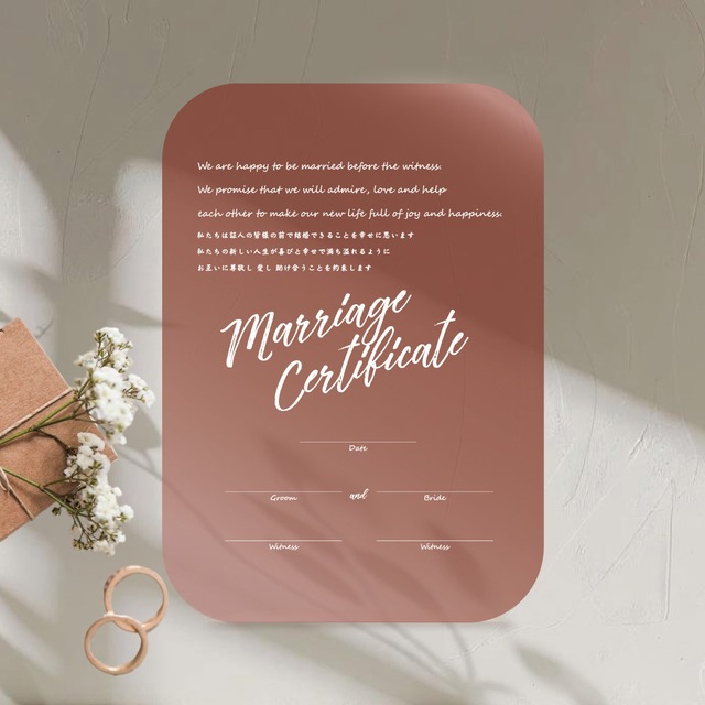 海外で人気の透明アクリル結婚証明書です! 人前式・教会式・オリジナル文、 お名前・日付・会場名の印字あり/なしをお選びいただけます。 ◆ご注文時に「A~H」の誓いの言葉を選びお知らせくださいませ。 印刷は専門業者様に依頼するので綺麗な仕上がりです。 アクリルなので、マーカーなどで記入することができます。 ━━━━━━━━━━━━━━━━━━━━━━━━ ※最短5日発送は お日にち優先して作成・発送いたしますので、 ご注文受付時のご挨拶は発送完了時の 追跡番号と合わせメッセージでご連絡いたします。 完成イメージ画像は出品画像をご参照いただければ幸いです。 ※ご購入後の配送方法の変更は出来ませんので慎重にお願い致します。 ━━━━━━━━━━━━━━━━━━━ ◆名前.日付.会場印字ありをご希望の方へ ━━━━━━━━━━━━━━━━━━━ オプションになります。 下記を追加いただき https://momonoha1.official.ec/items/78050400 ご注文時のメッセージ又は備考欄に文章を記入ください。 後日メッセージへ完成イメージ画像お送りします。 お知らせいただいた内容入力通りに印字 ※コピー&ペーストいたします 1.挙式日:英語表記でも数字でもOK 2.挙式会場名 3.新郎新婦さまのお名前:アルファベット表記 ※印字不要な場合は無しと記入ください ━━━━━━━━━━━━━━━━━━━━━━━ ◆オリジナルの「誓いの言葉」の文をご希望の方へ ━━━━━━━━━━━━━━━━━━━━━━━ オプションになります。 下記を追加くださいませ。 https://momonoha1.official.ec/items/26164342 オリジナルの「誓いの言葉」の文章は ご注文時のメッセージ又は備考欄に文章を記入ください。 後日メッセージへ完成イメージ画像お送りします。 ※文字データ(画像不可)でお願いします。 ※文字数の制限は特に設けておりません。 文字の大きさやイラストの配置などで 出来るだけ対応させて頂きます。 ━━━━━━ サイズ・仕様 ━━━━━━ ◆アクリル板 透明な5mm厚のアクリル板に直接印刷いたします。 クリアな見た目がおしゃれで 海外ウェディングでもトレンドになっています。 ◆サイズ A4(210×297mm)、B5(182×257mm) 商品写真は立会人2名の署名欄ありのデザインになります。 立会人サインは、 ご友人やご家族の方にサプライズとして ご記入いただくのも思い出になり素敵です♪ 教会式(チャペル)では牧師様のサイン欄がございます。 ◆印刷見本(試し刷り)サービスは行っておりません。ご了承くださいませ。 ━━━━━ 納期・発送 ━━━━━ ◆発送 印刷業者様からの直送 日時指定は致しかねますのでご了承ください。 ◆納期 最短での作成・出荷にて調整していますので、 発送までの目安日より早い対応はできかねます。 「〇〇日まで到着希望」には返答回答できません… *納期カウントの開始はご注文日ではなく、 ご入金及び作成に必要な全ての情報が揃った日より開始となります。 ご注文内容に不備や不足がございました場合は納期が延びてしまいます。 *お住いの地域や交通状況により配送が遅れる場合もございますので、 余裕を持ってご注文ください。 ━━━━ 注意事項 ━━━━ *お使いのモニター設定や使用環境によっては、 実際の商品と色味が違って見える場合がございます。 *イメージと違うとの返品はできません。 *額縁・イーゼルなど撮影のために使用した物は商品には含まれません。 結婚証明書.ウェルカムスペース.ウェディング.結婚式.受付スペース 水彩.人前式.演出.インテリア.キャンバスプリント.おしゃれ. 葉っぱ.ガーデン.グリーン.席札.芳名カード.返信ハガキ、招待状. シンプル.ラスティック.木目.青.大人.夏.海.芳名帳.準備. 誓いの言葉.thankyou.タグ.プチギフト.花 木製.二次会.ブライダル.wedding.海外風.パネル.芳名用紙.ビーチフォト 和モダン.和婚.ヴィンテージ.love.WELCOME.花嫁.オリジナルデザイン 結婚祝い.ブーケ.ウェディングフォト.写真.ポスター.筆記体 人気.ウェディング小物.モノトーン.海外風. ボタニカル.ナチュラル.サムシングブルー.こどもカメラマン.説明. ドレス当て.クイズ.投票用紙.タキシード当て.ブーケ