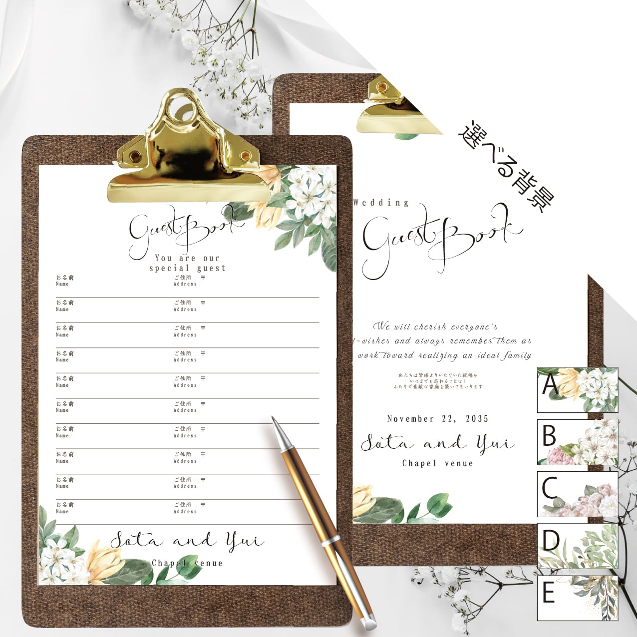 新郎新婦様のお名前と挙式日、会場名をお入れした表紙付きの